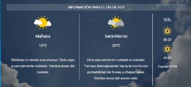 El SMN pronosticó un miércoles despejado con una mínima que estará en los 16° y una máxima que estará en los 26°. Por la noche hay probabilidad de lluvias.