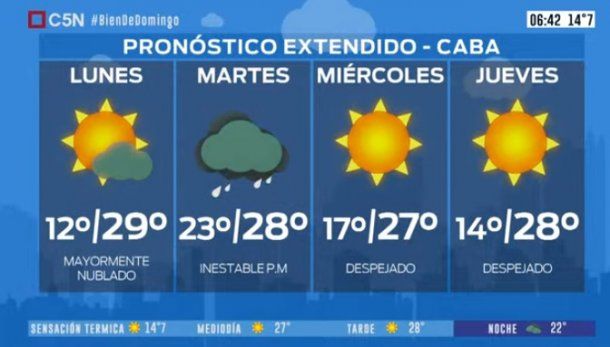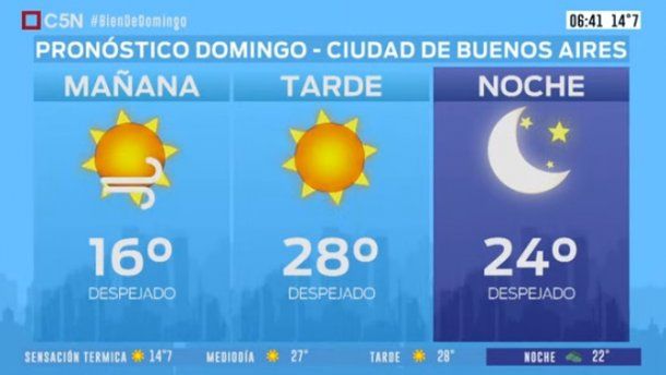 La jornada de este domingo se presenta en la Ciudad de Buenos Aires y alrededores con cielo despejado y una temperatura estimada en 14 grados de mínima y 28 grados de máxima, informó el Servicio Meteorológico Nacional (SMN).