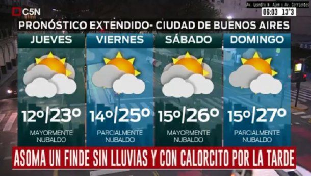En tanto, el viernes está pronosticado cielo mayormente nublado por la mañana, luego parcialmente nublado, vientos del sector noreste y una temperatura que se ubicará entre los 16 grados de mínima y los 25 de máxima.