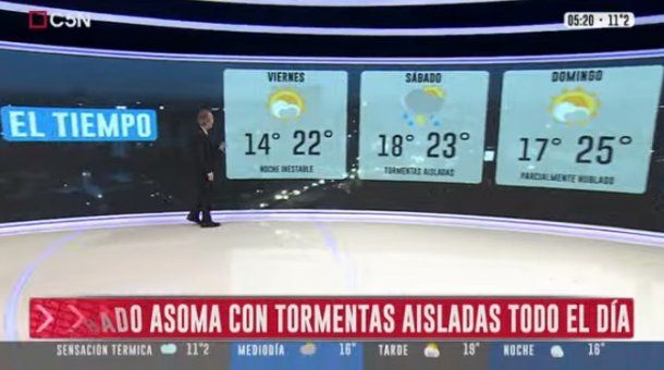 En tanto, el viernes está pronosticado cielo parcialmente nublado, vientos del sector norte rotando al este y una temperatura mínima de 15 grados y una máxima de 22 grados.