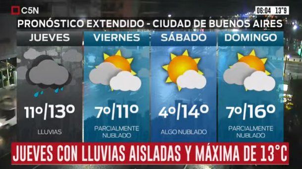 El viernes, en tanto, está pronosticado con un mínima de 7º y una máxima de 11º y vientos del suroeste.