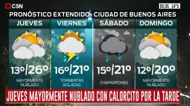 En tanto, el viernes está pronosticado cielo nublado y tormentas aisladas durante todo el día, vientos del sector noreste rotando al este, y la temperatura reducirá la brecha y se ubicará entre los 15 grados de mínima y los 22 de máxima.