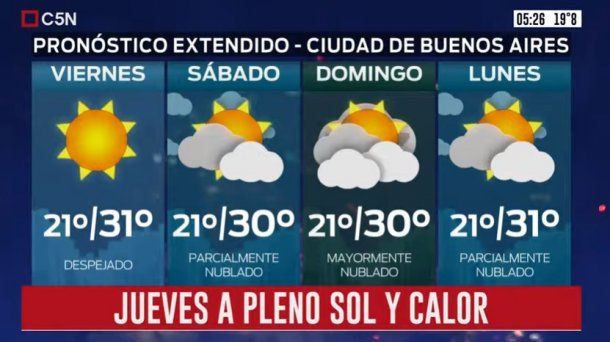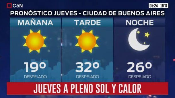 El Servicio Meteorológico Nacional (SMN) anticipa para este jueves en la Ciudad de Buenos Aires y el Conurbano un día bien de verano, con altas temperaturas y un sol pleno durante todo el día.