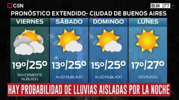 En tanto, el viernes está pronosticado cielo mayormente nublado, vientos del sector sudeste rotando al este, con ráfagas de hasta 50 kilómetros por hora durante la mañana, y la temperatura estará entre una los 19 y los 25 grados.