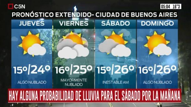 Para el viernes, en tanto, se anuncia cielo parcialmente nublado una temperatura de entre 16 y 25 grados, y vientos que soplarán desde el sector sureste para luego rotar hacia el este.