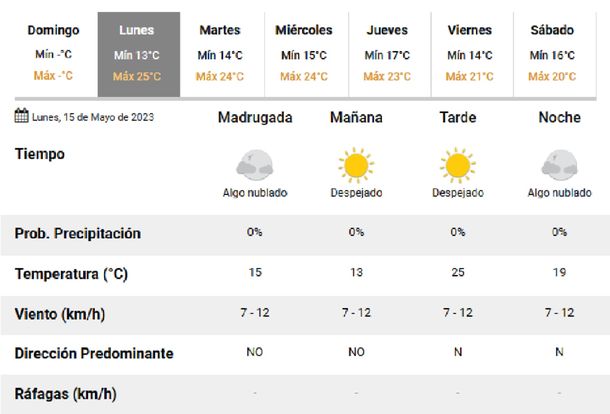 Para este lunes se esperan condiciones similares a las del domingo: mínima 13 grados, máxima 25. El cielo estará nublado por la mañana y despejado por la tarde.