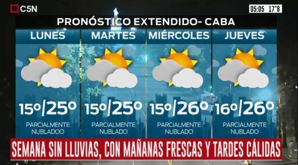 En tanto, el martes está pronosticado cielo parcialmente nublado, vientos del sector norte y una temperatura de entre 14 grados de mínima y 24 de máxima.