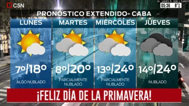 El Servicio Meteorológico Nacional (SMN) anticipa para este lunes, día en que arranca la primavera, un día con un comienzo fresco en la Ciudad de Buenos Aires y el Conurbano y una tarde templada con pocas nubes.