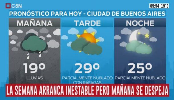 Para este lunes el organismo anticipa lluvias y probables tormentas por la mañana, con una temperatura mínima de 19 grados y una máxima de 29. Por la tarde el tiempo mejora y el cielo estará de mayor a parcialmente nublado.