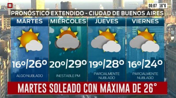 El organismo prevé una jornada con cielo entre algo y parcialmente nublado, vientos del sector noreste rotando al norte y al este, y una temperatura en ascenso, que se ubicará entre los 16 grados de mínima y 26 de máxima.