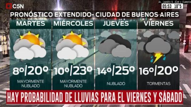 El organismo prevé una jornada con cielo de parcial a mayormente nublado, vientos del sector norte rotando al este y al norte, y una temperatura que estará entre los 9 grados de mínima y los 21 de máxima.