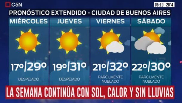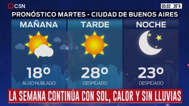 En tanto, el miércoles está pronosticado cielo despejado, vientos del sector noroeste rotando al norte y una temperatura que estará entre los 17 grados de mínima y los 30 de máxima.