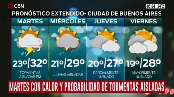 El organismo prevé una jornada con cielo mayormente nublado y tormentas aisladas por la tarde y la noche, vientos del sector norte rotando al este y una temperatura que alcanzará una mínima de 23 grados y una máxima de 32.