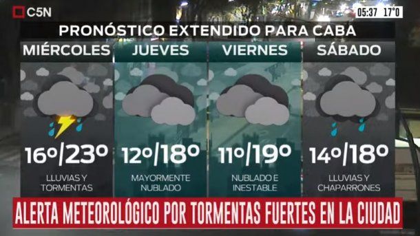 En tanto, el miércoles está pronosticado tormentas aisladas durante todo el día, vientos del sector norte y una temperatura templada con una mínima de 17 grados y una máxima de 23.