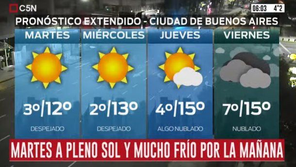 El Servicio Meteorológico Nacional (SMN) prevé para este martes en la Ciudad de Buenos Aires y alrededores un clima con cielo absolutamente despejado, la presencia de sol durante todo el día y el termómetro bajo en el primero de una seguidilla de días con temperaturas cercanas a los 0 grados.