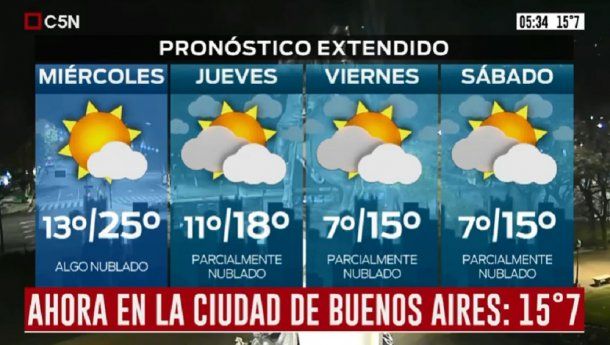 En tanto, el miércoles está pronosticado cielo parcialmente nublado, vientos del sector suroeste rotando al sur y una temperatura mínima de 13 grados y una máxima de 25.