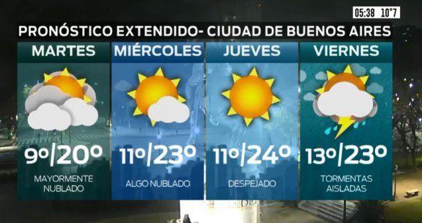 En tanto, el miércoles está pronosticado cielo parcialmente nublado, vientos del sector noroeste rotando al noreste y una temperatura que se ubicará entre los 11 grados de mínima y los 23 de máxima.