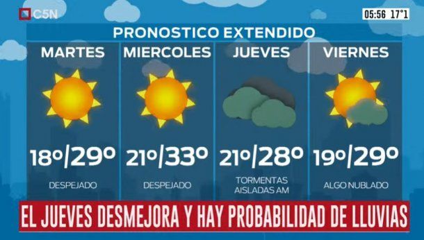 En tanto, el jueves llegarían las lluvias por la mañana con tormentas aisladas, vientos del sector sur y una temperatura de 21 grados de mínima y 28 de máxima.