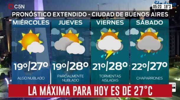El jueves, en tanto, se prevé cielo parcialmente nublado, vientos del noreste y marcas térmicas que oscilarán entre los 19 y los 28 grados.