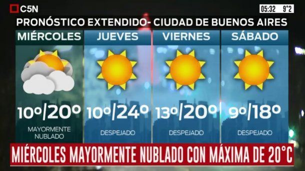 En tanto, el jueves está pronosticado cielo algo nublado a despejado, vientos del sector oeste rotando al noroeste, y una temperatura que estará entre los 10 grados de mínima y los 24 de máxima.