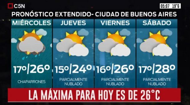 En tanto, el jueves mejora el clima y está pronosticado cielo algo nublado a parcialmente nublado, vientos del sector este, y una temperatura que tendrá una mínima de 15 grados y una máxima de 24.