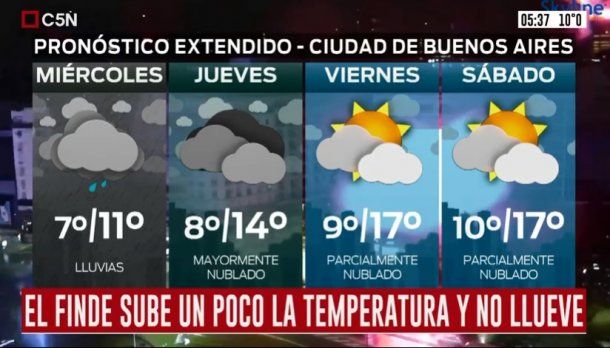 En tanto, el jueves está pronosticado cielo mayormente nublado, vientos del sector sudoeste rotando al oeste, y una temperatura de entre 8 y 14 grados.