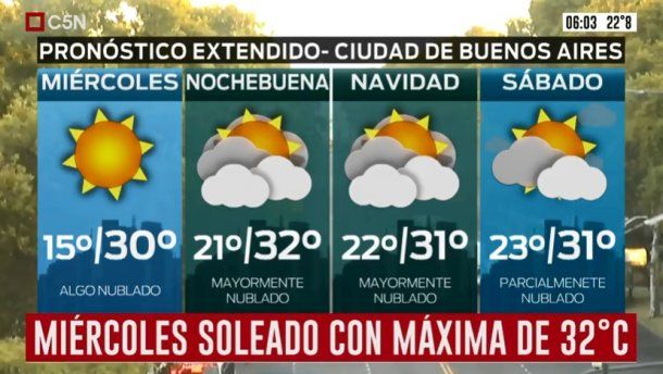 El jueves de Nochebuena, en tanto, se prevé cielo parcial a mayormente nublado, vientos del noreste rotando al este y marcas térmicas que oscilarán entre los 21 y los 32 grados.