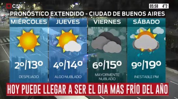 El Servicio Meteorológico Nacional (SMN) prevé para este miércoles en la Ciudad de Buenos Aires y alrededores una jornada polar, con mínima de 2 grados en lo que podría llegar a ser el día más frío del año.