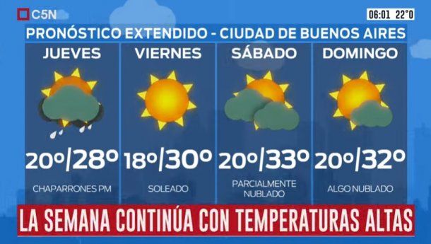 El jueves, en tanto, el organismo pronosticó probables chaparrones durante todo el día, vientos del sur y una temperatura mínima de 21 grados y una máxima de 28.