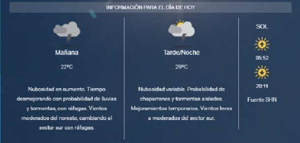 El Servicio Meteorológico Nacional estima nubosidad en aumento, la probabilidad de precipitaciones y una temperatura que rondará entre los 22° y los 29°.