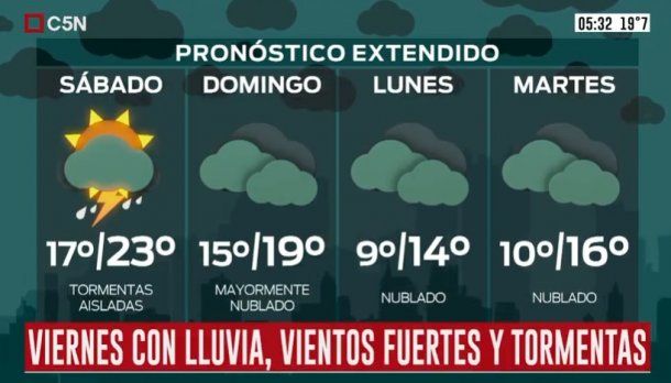 El sábado está pronosticado que continúen las tormentas aisladas, con vientos del este rotando al sudeste y ráfagas de hasta 50 kilómetros por hora, y una temperatura que oscilará entre los 17 grados de mínima y 23 de máxima.