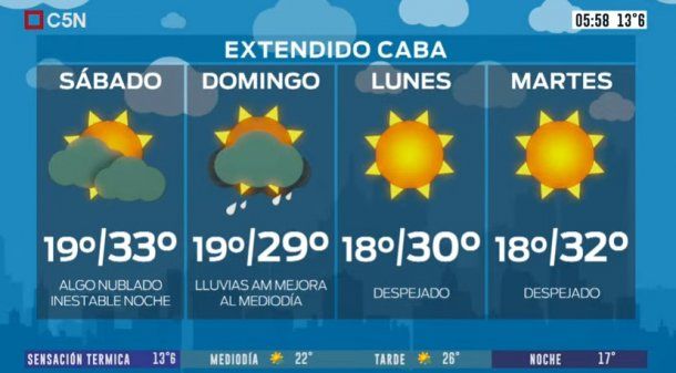 Para el sábado se espera cielo mayormente nublado, vientos moderados a leves del norte y una temperatura que irá de los 19 a los 33 grados, con tiempo desmejorando hacia la noche.