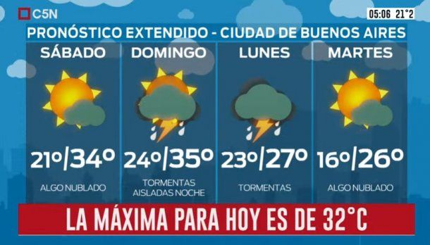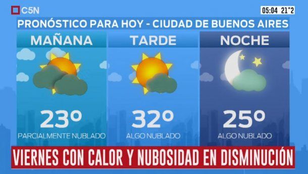 El Servicio Meteorológico Nacional (SMN) prevé para este viernes en la Ciudad de Buenos Aires otra jornada de intenso calor y cielo mayormente despejado, luego de algunas tormentas aisladas en las primeras horas del día que aliviaron un poco la temperatura matinal.