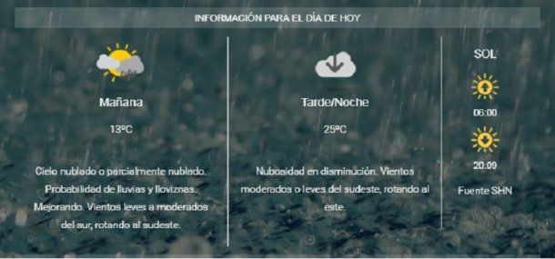 El Servicio Meteorológico Nacional pronostica un cielo nublado o parcialmente nublado con probabilidad de lluvias por la mañana, una mejora por la tarde noche y una temperatura que rondará entre los 13 y 25 grados.