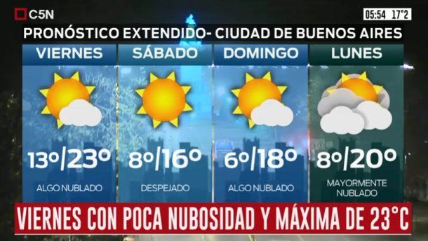 En tanto el sábado, está pronosticado cielo algo nublado por la mañana, y despejado por la tarde, con vientos del sudoeste y una temperatura que tendrá un leve descenso y se ubicará entre una mínima de 8 grados y una máxima de 16.