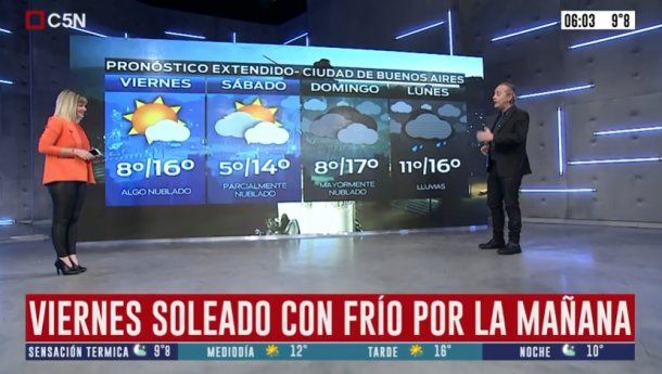 En tanto, el sábado está pronosticado cielo parcialmente nublado, vientos del sector este y una temperatura de entre 5 y 14 grados.