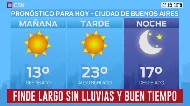 El Servicio Meteorológico Nacional (SMN) anuncia para este viernes un día con pocas nubes, un comienzo muy fresco y una tarde agradable en la previa de un fin de semana largo en el que lentamente irá subiendo la temperatura.