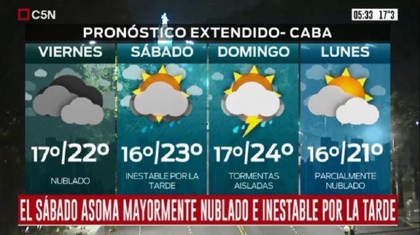 En tanto, el sábado está pronosticado cielo nublado durante la mañana, con algunas tormentas aisladas por la tarde, continúan los vientos del sector este y la temperatura se ubicará entre los 16 grados de mínima y los 23 de máxima.