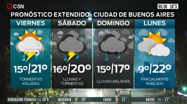 El Servicio Meteorológico Nacional (SMN) anticipa para este viernes (y para todo el fin de semana) en la Ciudad de Buenos Aires tiempo inestable, cielo gris y la probabilidad de tormentas durante toda la jornada.