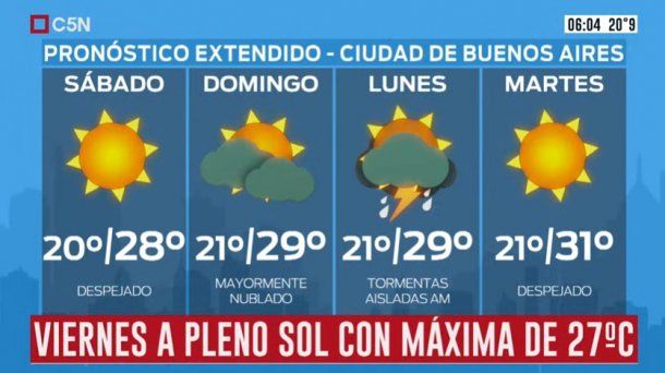 En tanto, el sábado está pronosticado cielo despejado, vientos del sector norte rotando al noreste con temperatura mínima de 20 grados y una máxima de 28.
