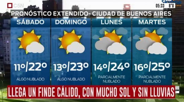El Servicio Meteorológico Nacional (SMN) anticipa para este viernes en la Ciudad de Buenos Aires y el Conurbano una jornada agradable que dará paso a un fin de semana con muy buenas condiciones climáticas y sin probabilidades de lluvia.