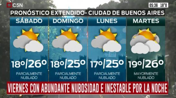 La misma se mantendrá durante la madrugada y la mañana del sábado, cuando está pronosticado tormentas aisladas por la mañana y luego cielo parcialmente nublado, con vientos del sector este y una temperatura que estará entre 18 y 26 grados.
