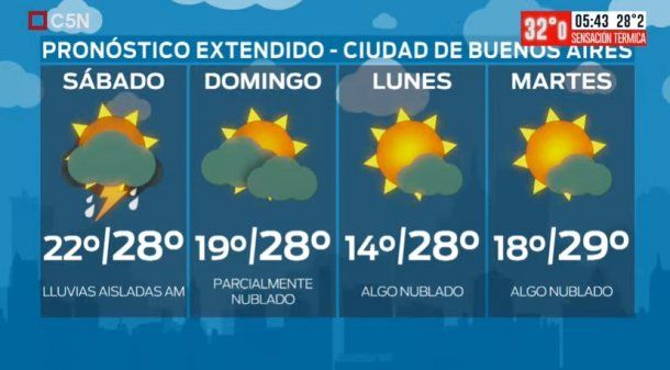 Finalmente, el domingo se espera cielo mayormente nublado y un nuevo descenso de la temperatura, que se ubicará en 19 grados de mínima y 28 de máxima.