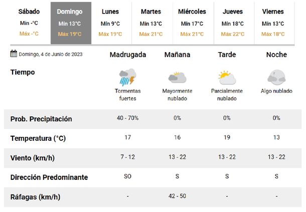 Desde la noche y durante la jornada del lunes, las nubes se irán disipando sobre la región, donde el cielo estará solo parcialmente nublado. La temperatura mínima bajará a los 9° pero la máxima del día se ubicará también en los 19°.