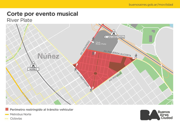 La serie de recitales del grupo musical Coldplay en el estadio de River, que se darán a partir de esta noche y durarán a lo largo de 10 días, obligará a realizar cortes de tránsito sobre algunas calles y avenidas en un sector del barrio porteño de Núñez, informaron fuentes del ministerio de Transporte y de Seguridad de la Ciudad de Buenos Aires.
