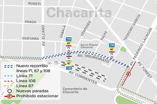 Tres líneas de colectivos modificaron sus recorridos y desde el jueves e ingresan al barrio Playón de Chacarita por la avenida Triunvirato. Se trata de las líneas 71, 87 y 108.