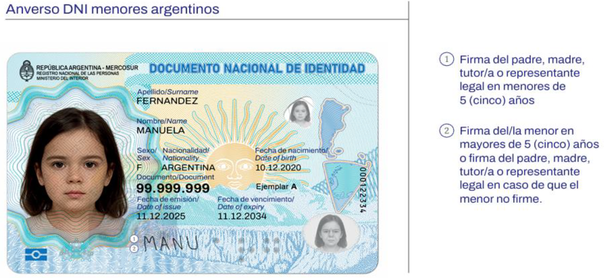En el caso de los menores de edad, además de poseer las mismas características que el de los mayores, se contempla que, solo para los niños menores de 5 años, deberá firmar el padre, madre, tutor o representante legal.