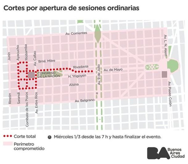 La circulación en el centro porteño se verá alterada, especialmente en las inmediaciones del Palacio Legislativo, por la inauguración de la actividad parlamentaria.