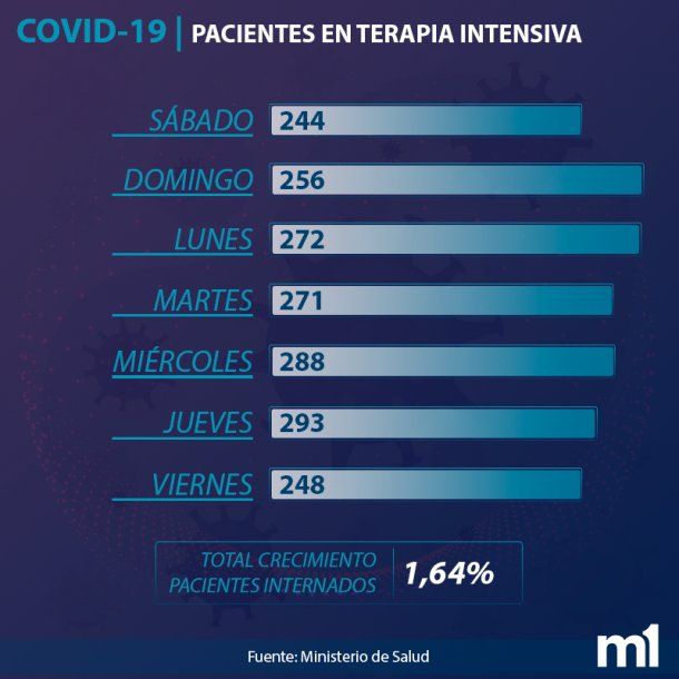 Según el reporte matutino del Ministerio de Salud de la Nación, el pasado sábado eran 244 las personas internadas en camas de terapia intensiva por coronavirus. Este viernes, la cifra fue de 248.