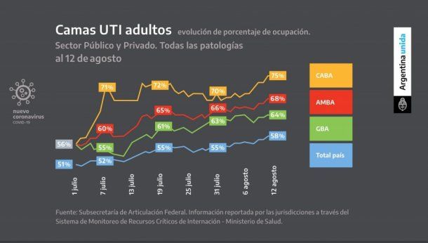 La ocupación de camas de cuidados intensivos, más allá de la dolencia que explique la internación del paciente, a nivel nacional promedia el 58,3%, mientras que en el Área Metropolitana de Buenos Aires (AMBA) llega al 68,4%.